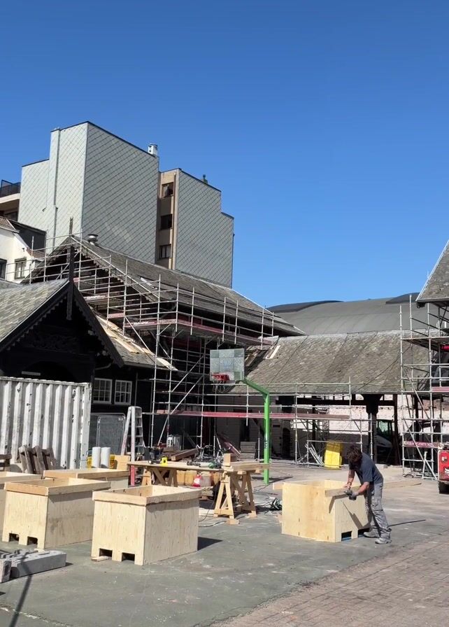 Here is a detailed description of the video: The video shows an outdoor construction site on a bright, sunny day. The main focus is a dark wooden building covered in scaffolding, indicating renovation or repair work is underway. There are several red and white striped dumpsters near the building. A man is cutting wood on one of three large wooden crates that are situated on the construction site. A basketball hoop stands close by. The ground is paved with bricks. Behind the construction site, taller modern buildings can be seen. Throughout the video, the camera pans from left to right, showing different angles of the site, including a close-up of the scaffolding on the building and a red construction fence. A tree with budding leaves stands near the fence.