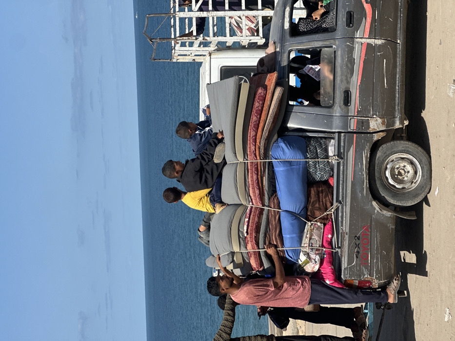 A dark gray, weathered Toyota 4x2 pickup truck is depicted in a coastal setting in Jazirat an Nasirat, Unknown. The truck's bed is heavily overloaded with household belongings, primarily consisting of a tall stack of approximately five to six mattresses or large cushions of varying colors (gray, maroon, orange, patterned) secured with white ropes. Below these, large blue tarp-wrapped bundles and other patterned fabric bundles are visible. Three young males, appearing to be children, are seated on top of the stacked mattresses, facing towards the right side of the frame and observing the sea. The boy on the left wears a yellow long-sleeved shirt, the one in the center wears a black long-sleeved shirt, and the boy on the right wears a blue and white striped long-sleeved jacket, looking down at something in his hands. To the left of the truck, a young adult male in a reddish-orange t-shirt and dark trousers stands on a narrow step-like platform attached to the truck's rear. He holds onto the ropes securing the cargo. Other individuals are partially visible: an arm and shoulder of a person in dark clothing to the left of the man, and a person with a patterned head covering and dark attire visible in the front passenger seat of the pickup through the open window. Another lighter-colored truck with a metal caged bed is partially visible behind and to the right of the pickup. The background features a vast expanse of blue sea with a discernible horizon, under a clear blue sky with minimal cloud cover. The foreground consists of light brown, unpaved ground.