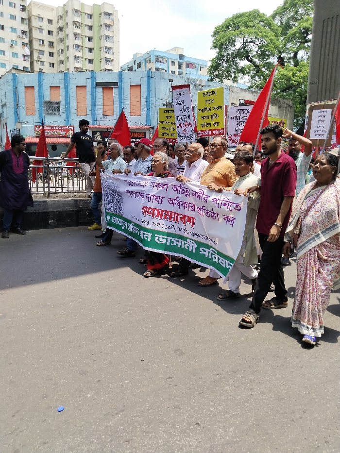 The image captures a street protest in Dhaka, Bangladesh, at the intersection of Green Road and Dhaka University campus, located at the coordinates 23