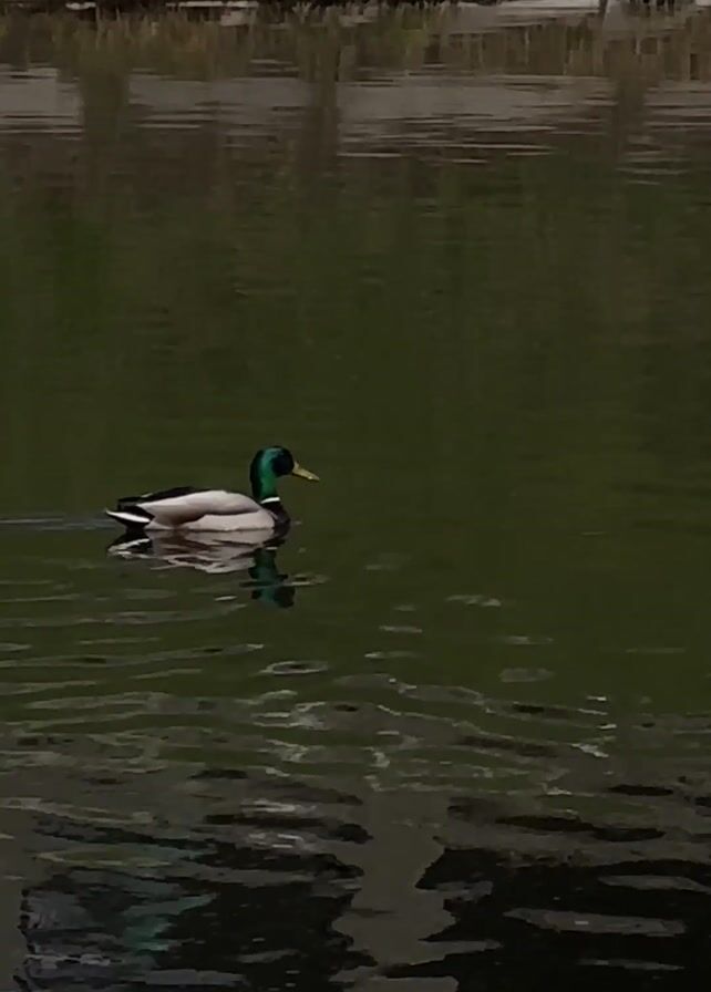 A single mallard duck is swimming in a pond or lake