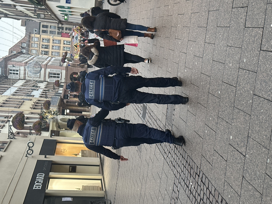 Two police officers patrol a busy pedestrian street, wearing dark blue uniforms with the words "POLICE MUNICIPALE" printed on their backs. Passersby walk in the opposite direction. Buildings line the street with shops and decorated windows. The pavement is paved with rectangular grey stones. Overhead Christmas decorations add to the festive ambiance. The photo captures an everyday scene of law enforcement presence in a public space.