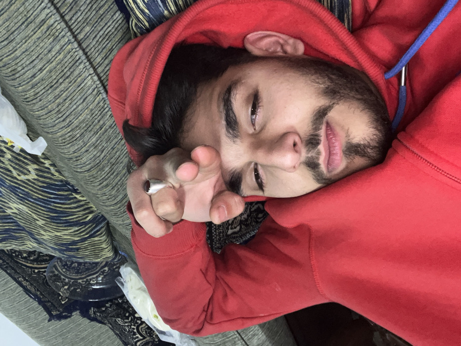 A man with dark hair and a beard, wearing a red hoodie, reclines in a horizontal orientation. He is holding a lit cigarette between his fingers. His eyes are partially closed, and he gazes towards the camera. The background consists of a patterned sofa and a plastic bag. A ring adorns one of his fingers.