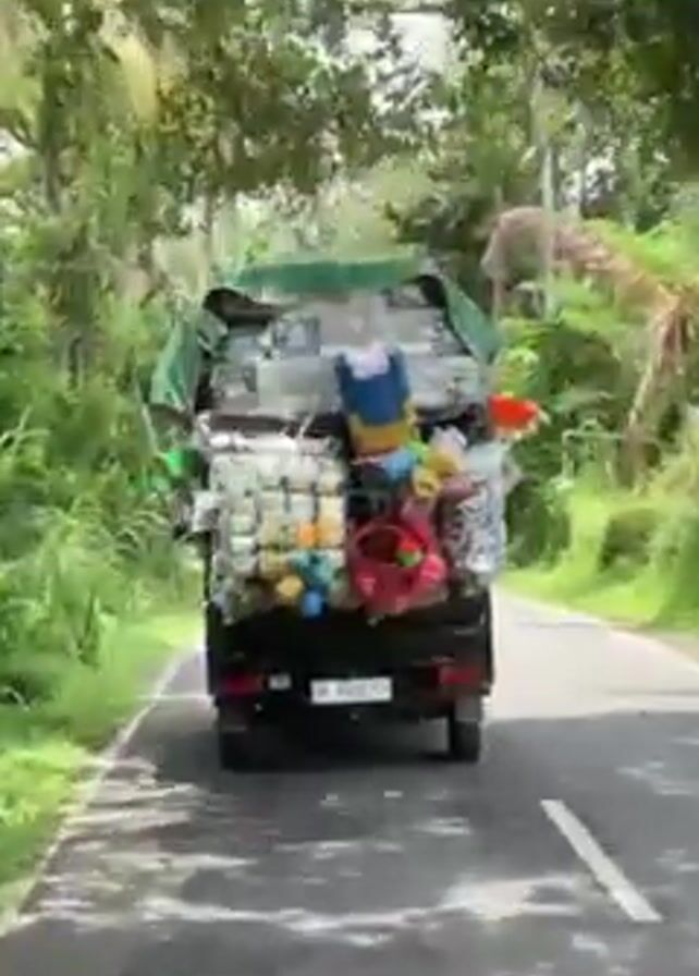 rear of a dark-colored truck driving down a paved road bordered by dense green foliage on both sides. The truck is heavily laden with various items, including stacks of cylindrical objects, colorful plastic items, and some covered equipment. A green tarp is draped over part of the load. The truck's license plate is visible. The road has a white line marking its edge. The environment is bright and sunny, suggesting a tropical or lush setting.
