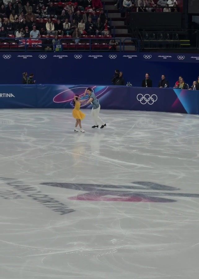 Two couples are ice-skating in front of a crowd. The rink has the official logo of the Milano Cortina 2026 Olympics. The first pair wears matching yellow and light blue outfits. The woman has a short yellow dress, and the man has a light blue vest and pants. The second couple wears black and gold outfits. The woman has a short black dress with gold accents, and the man wears all black. As the first couple nears the end of their routine, the woman spins as the man skates away. Then, the second couple begins skating.