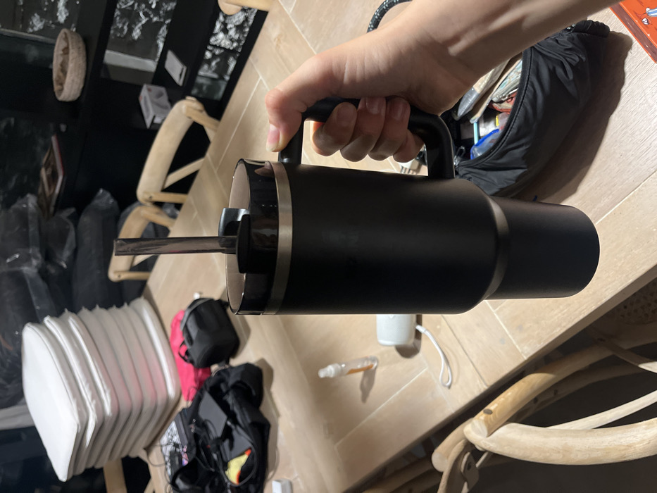 A hand holds a black, cylindrical, insulated beverage container with a handle. A metal straw is inserted. The container sits on a wooden surface near chairs and bags. A small white cup and a travel-sized bottle are nearby. The background includes stacked chairs and a black shelf unit. The scene is somewhat cluttered and indoors.