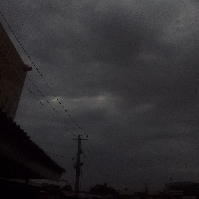 A somber landscape under a heavily clouded, dark sky. Power lines stretch across the frame, connecting a utility pole. Buildings and vegetation are silhouetted against the gloom. A corner of a sign, partially visible, reads "Delights." The scene evokes a sense of overcast weather, with the low-light conditions obscuring details and creating a muted, almost monochrome palette.
