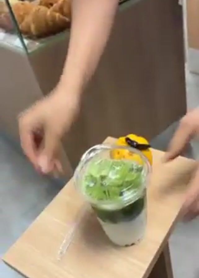 person placing a plastic cup containing a layered drink on a small table next to a display case of croissants. The drink appears to have a white layer at the bottom and a green layer on top, possibly a matcha latte. The person places a straw next to the cup. The video then shows two people behind the counter of the bakery. Both are wearing aprons and t-shirts. One is working at a register. The other is walking toward the back.