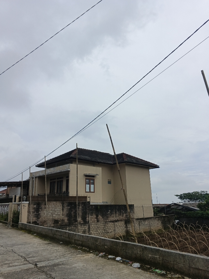 The image displays an exterior scene in Bhimad, Nepal, under an overcast sky. A two-story, light beige residential building with a dark tiled hip roof is centrally located behind a weathered brick and concrete retaining wall. The house features a second-story balcony with a dark railing and at least one prominent brown-framed window. Multiple utility wires stretch diagonally across the upper portion of the frame, supported by several thin, natural wood or bamboo poles. The foreground consists of a concrete road or pathway with a curb, showing scattered litter. To the right of the house, an uncultivated plot of land with dry, matted vegetation is visible, partially enclosed by a wire mesh fence. Distant structures and green foliage are discernible on the horizon. No individuals, animals, or active interactions are present in the scene.