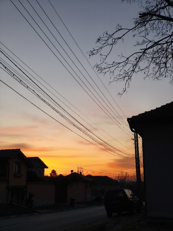 - "An outdoor scene captured at dusk in Slavyanovo, Bulgaria, depicts a residential street silhouetted against a vibrant sunset" by FM-r4Hhz2, licensed under CC BY 4.0