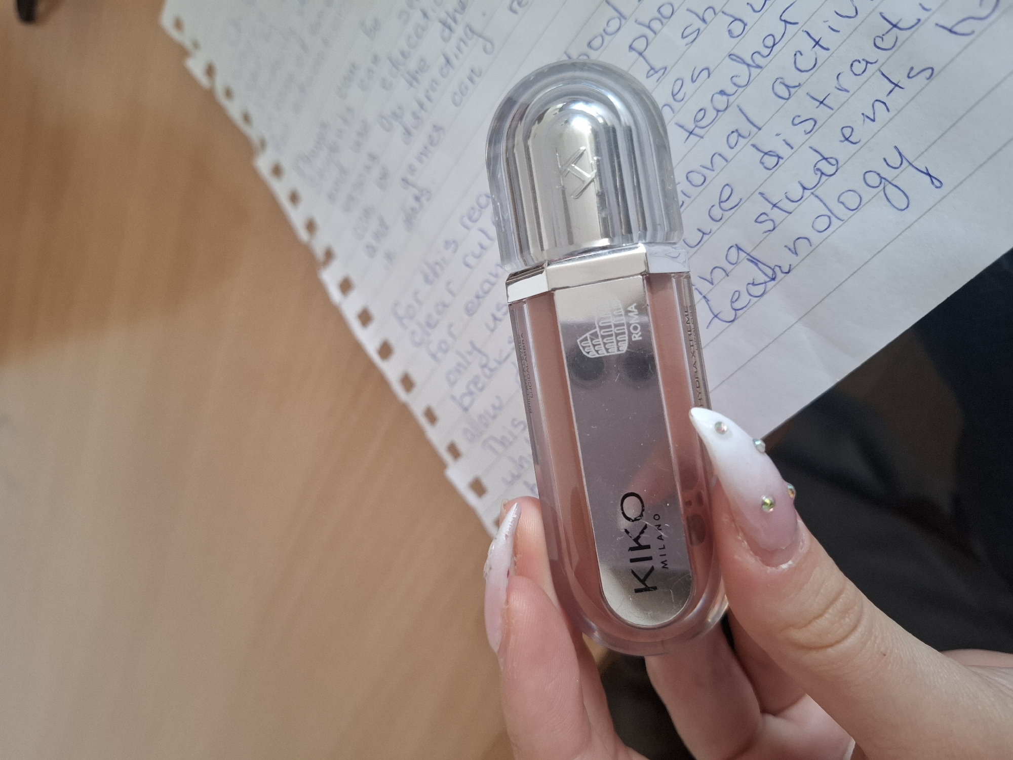 A right human hand with manicured, ombré-style fingernails (pink transitioning to white) adorned with small rhinestones on the ring and middle fingers, holds a KIKO MILANO "HYDRA XTREME" lip gloss or liquid lipstick container. The transparent container holds a light brown liquid, featuring a silver label with the KIKO MILANO logo, a depiction of the Colosseum, and the word "ROMA." The silver-toned, ribbed cap displays an embossed 'K' logo. This object is positioned above a piece of white, lined notebook paper bearing handwritten text in blue ink, including words such as "education," "distracting," "clear rule," "teacher," "students," and "technology." The paper rests on a light brown, smooth wooden surface, likely a desk or table, indicating an indoor environment. The image does not contain information sufficient to identify its location within the city of Panagyurishte, Bulgaria.