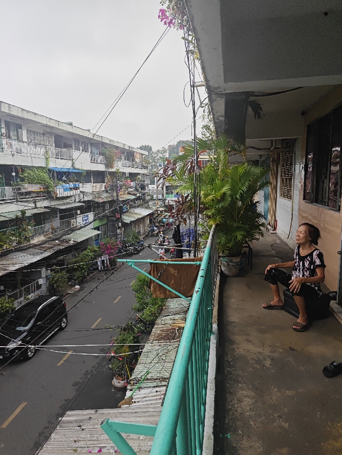 An older woman sits on a dark surface on a weathered balcony overlooking a busy street in an urban setting. She wears a patterned top and dark pants. The street below is lined with buildings and vehicles. Plants grow in pots on the balcony and along the street, adding a touch of greenery to the scene. Overhead, wires crisscross between buildings. The sky is overcast, creating a muted light.