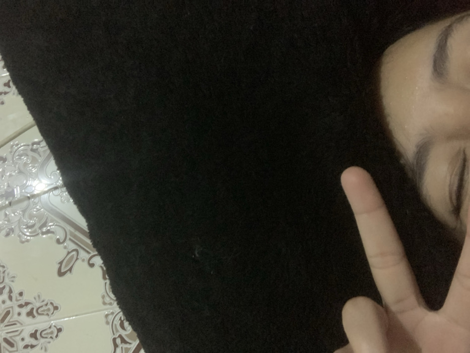 A close-up shows a person lying down, partially visible in the upper right, with their eyes closed and a two-finger peace sign displayed. Most of the image is occupied by a textured black surface, possibly fabric. A small section of patterned tile is visible in the lower left corner, adding a contrasting texture to the scene.