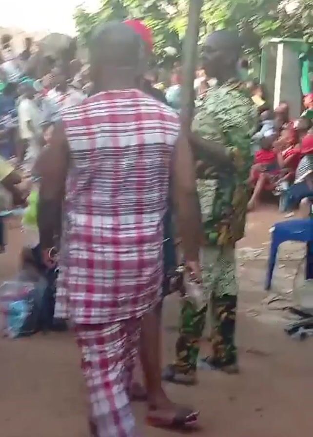 n outdoor gathering with a crowd of people, mostly seated. A woman in a dark dress and red head covering is standing, looking to the left. A man in a red and white plaid outfit stands in front of her, with his back to the camera. Another man in a camouflage outfit walks past them. There are trees and a white building visible in the background. The ground appears to be dirt or sand. Some children are visible in the crowd.