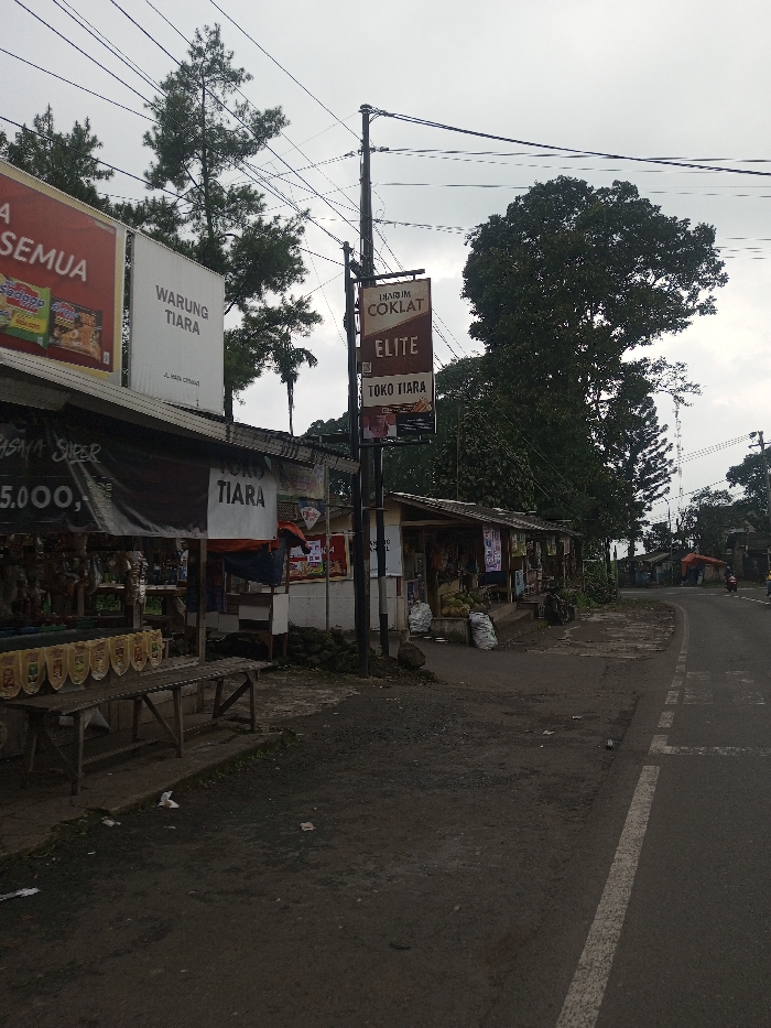 A roadside scene depicts a row of small shops under tin roofs, identified by signage that reads "Warung Tiara" and "Toko Tiara" along with advertisements for chocolate. Wares and various goods are displayed. A utility pole stands adjacent to the shops, carrying signage that reads "Djarum Cokelat Elite." The road extends into the distance, with a white line marking the edge. The overcast sky creates a muted lighting, with trees lining the background.