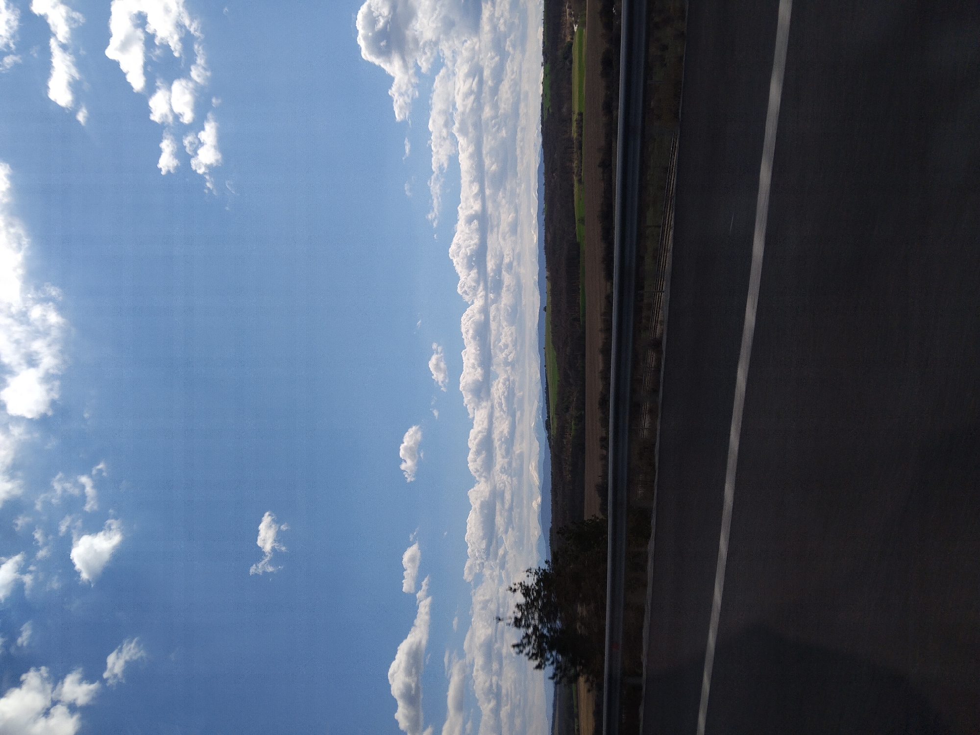 The image depicts a view from a moving vehicle on a road near Vakarel, Bulgaria. The sky dominates the scene, showcasing a bright blue hue with scattered cumulus clouds. A narrow strip of land, featuring fields and a treeline, runs along the horizon. A metal guardrail separates the foreground from the distant landscape. The road surface, asphalt, occupies a significant portion of the right side of the image and includes a painted white line denoting lane separation. The photo seems to be taken from a car, showing the landscape outside.