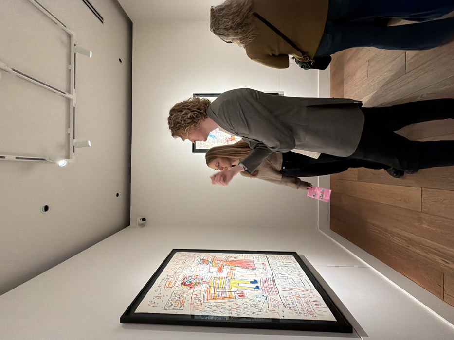 In an art gallery, a framed Basquiat-style painting hangs on a white wall