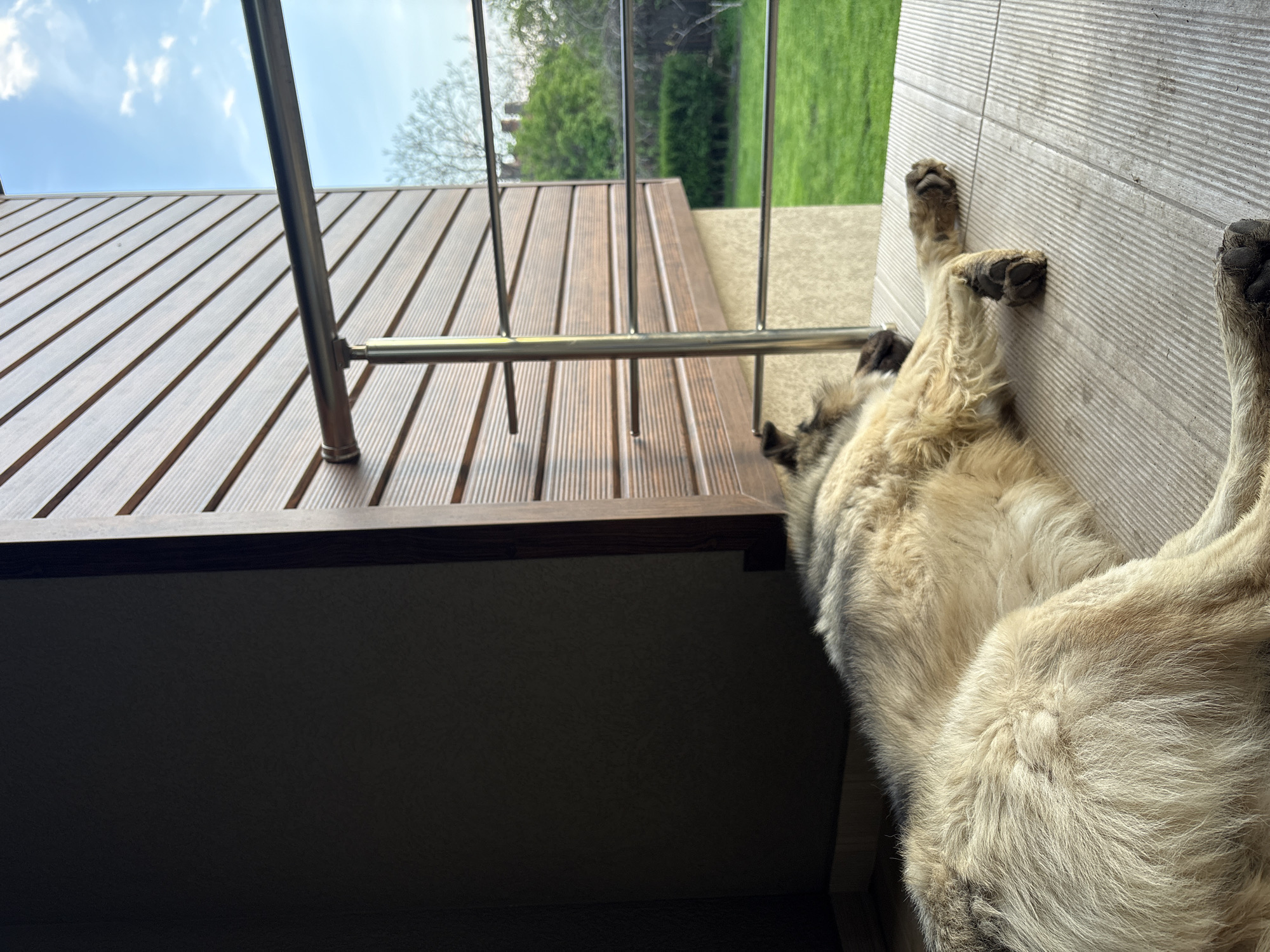 A dog is lying on a wooden deck. The deck has a metal railing. Beyond the railing is a lawn and some trees. The sky is visible in the upper left corner. The location appears to be a balcony or patio.