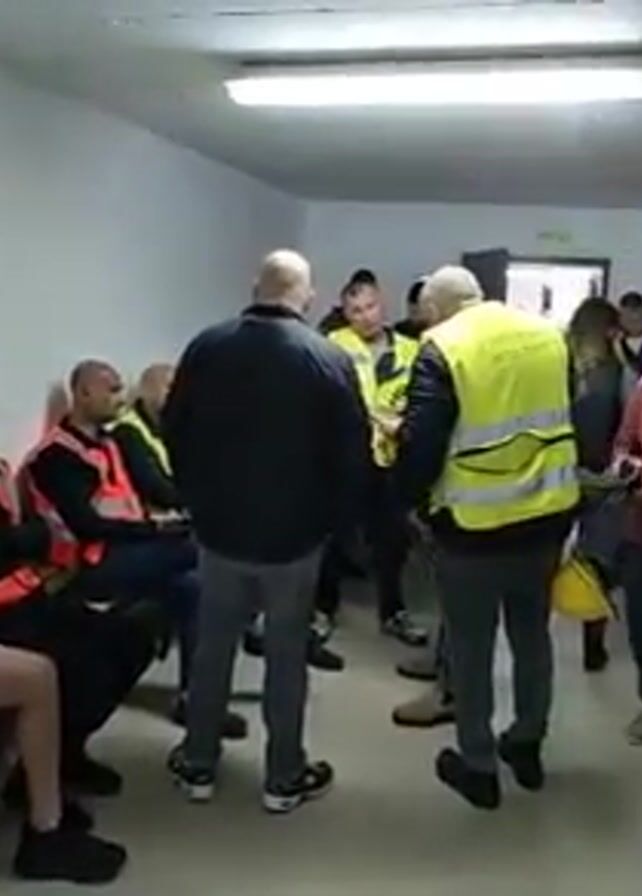 group of people standing and sitting in a room. Many of them are wearing high-visibility vests. Some individuals appear to be in uniform, possibly security personnel, and are walking through the room. The environment looks like an indoor waiting area or hallway, with fluorescent lighting and posters on the walls. There is a sign with Hebrew writing and a "portfolio" poster visible. The people seem to be gathering or waiting in this area.