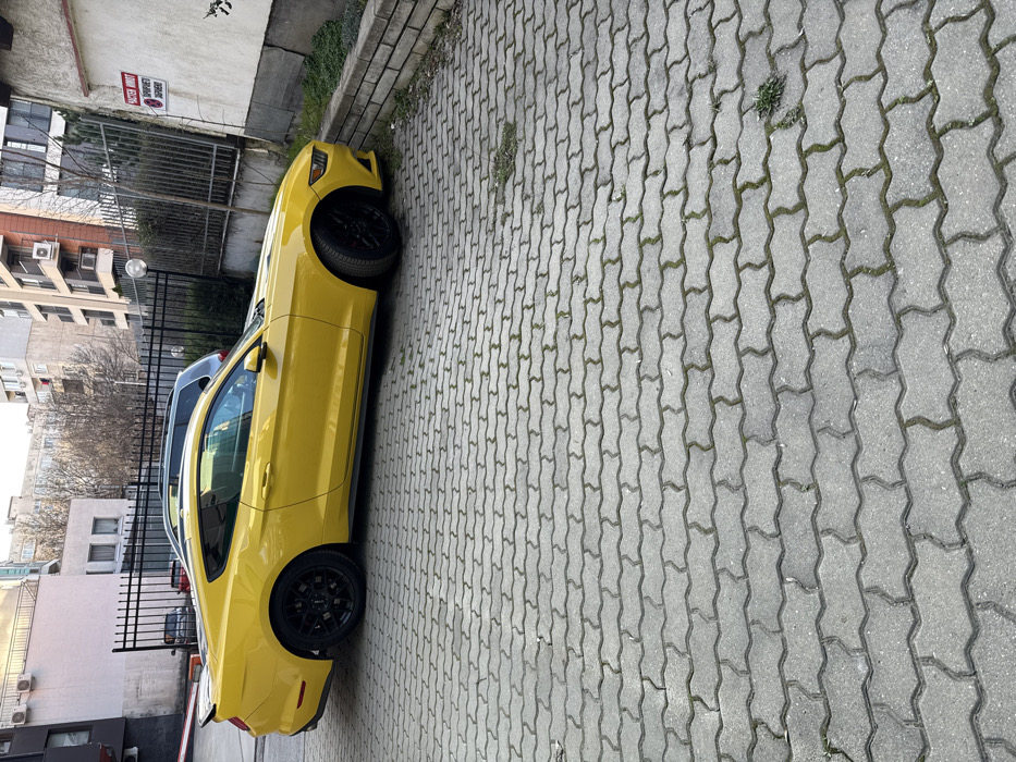 A bright yellow Ford Mustang, S550 generation, with black multi-spoke wheels, is parked on an outdoor lot paved with grey interlocking concrete pavers
