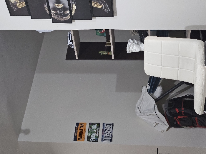 The image displays an indoor residential or office space in Cerro Prieto, Mexico. On the left wall, three decorative license plates are mounted vertically: a yellow "NEW YORK MANHATTAN" plate, a green "PURA VIDA" plate, and a blue "10Z-ZS3" plate. Below these, a white jacket is draped over a dark metal framework, with a black and red backpack partially visible on the floor beneath. In the foreground, a white chair with a tufted, square-patterned backrest is positioned. Behind the chair, a dark, multi-shelf unit is visible. Its top shelf holds a white miniature vehicle, the second shelf contains several golden cylindrical objects and a green rectangular item, and the third shelf features a white bust sculpture resembling Michelangelo's David. To the far right, a vertical stack of five black-framed art panels depicting circular golden patterns against a dark background is mounted on a light-colored wall. The room features light-colored walls and ambient lighting. No individuals are present.