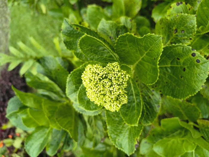The image showcases a cluster of vibrant green hydrangea buds, tightly packed at the center of the frame. These buds are surrounded by lush, textured green leaves, some displaying dark spots. Additional foliage fills the background, adding depth to the composition. The scene presents a close-up view of the plant, highlighting its intricate details and natural beauty.