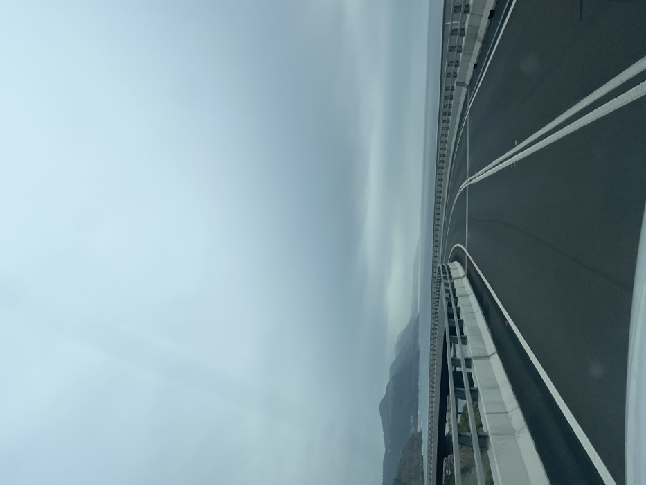 An elevated highway stretches into the distance, its asphalt surface divided by white lane markings. A barrier lines the edge of the road. On the horizon, mountains are visible through a layer of mist. A grey, overcast sky fills the upper portion of the scene, suggesting a day with low visibility. The perspective gives the viewer a sense of height and distance.