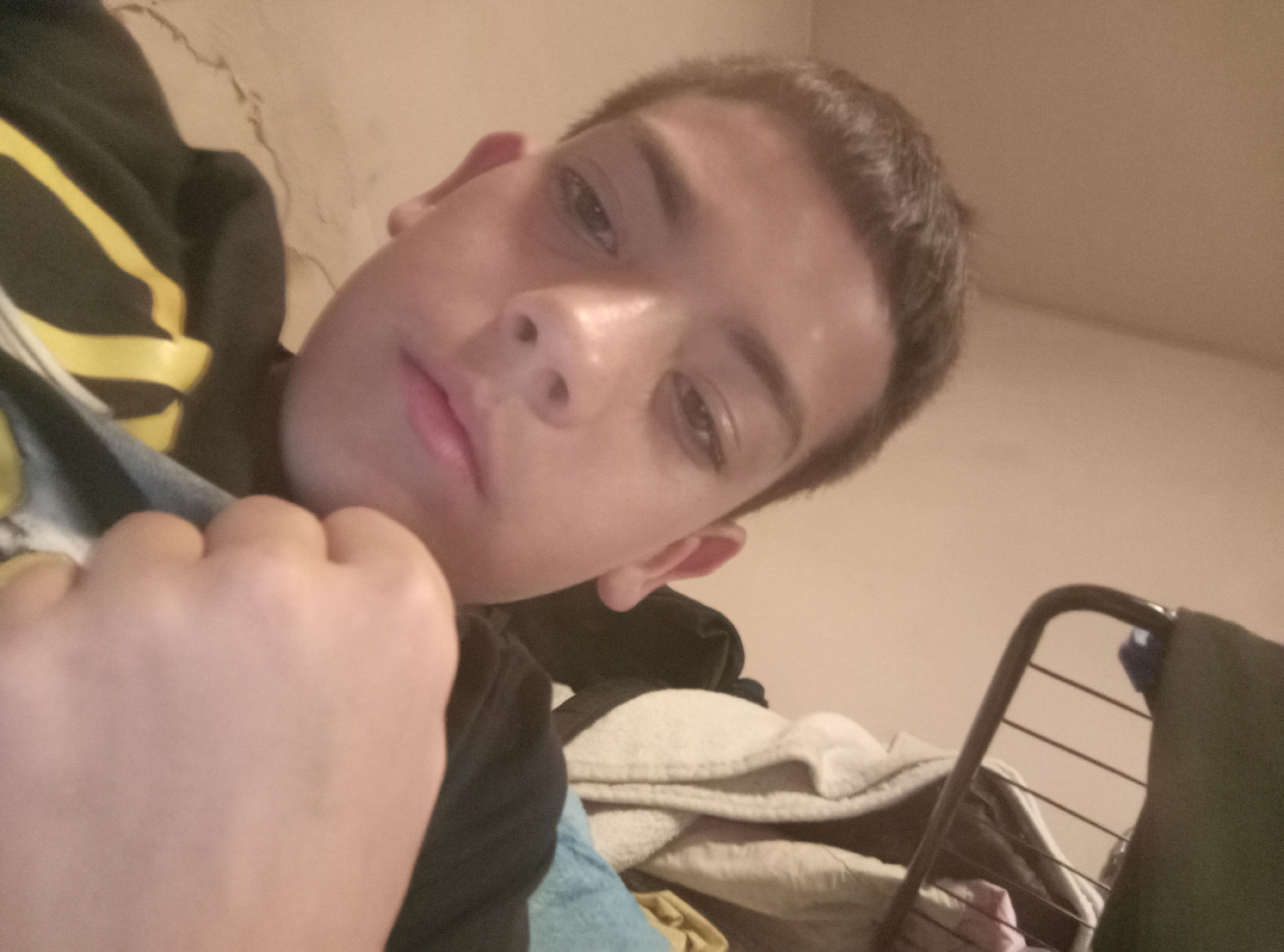 A close-up, upward-angled photograph shows a person with light brown skin, short, dark brown hair, and brown eyes. The person's face is centered in the frame, with their nose and mouth slightly prominent. They are wearing a black hoodie with yellow stripes on the shoulder and arm, which is visible on the left side of the image. The person's left hand is clenched into a fist and positioned near their chest. Behind the person, slightly out of focus, is a messy environment. There are blankets or clothes stacked on top of each other, and a dark-colored metal frame, possibly part of a bed or furniture. The background wall is a neutral, beige color. The location in Dolna Kremena, Bulgaria cannot be determined from this image alone. No specific elements in the image suggest this location.