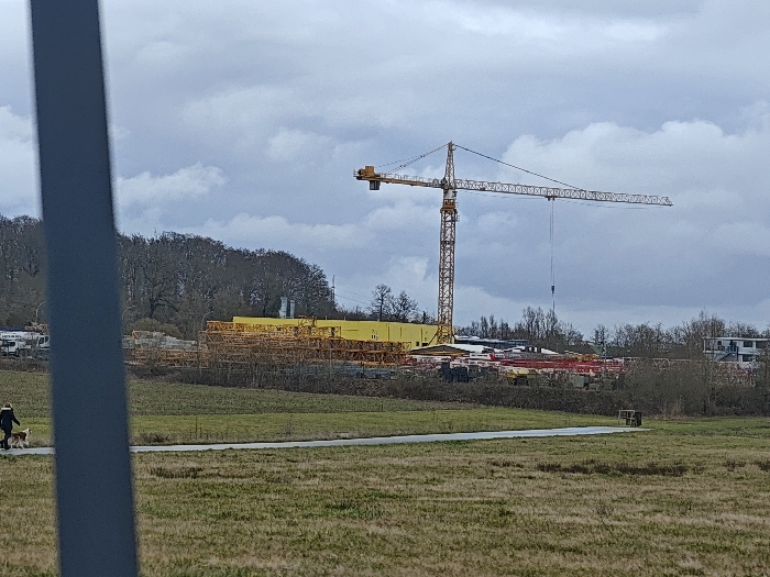 The image depicts an exterior scene in Leudelange, Luxembourg, under an overcast sky with light grey clouds. In the immediate foreground, a tall, grey vertical structural element partially obstructs the left side of the frame. The midground features a large, irregularly textured field of green and brown grass, bisected horizontally by a paved path. On this path, a single individual wearing dark clothing walks from left to right, accompanied by a light brown and white dog on a leash. A small, dark object is visible near the path on the right. The background reveals a construction site backed by a dense line of leafless deciduous trees. A prominent yellow tower crane stands tall, its boom extended horizontally over the construction area. Below the crane and partially obscured by the trees is a large, yellow building or structure. The construction site itself contains numerous stacked materials, some covered with red tarpaulins or netting. Several white utility vehicles or trucks are visible on the far left of the construction area. Further to the right, beyond the construction, a cluster of modern, white and grey multi-story buildings is visible.