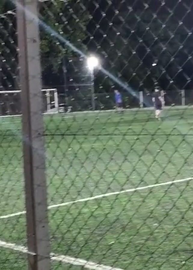 A group of men are playing soccer on a green field at night under bright spotlights. The game is viewed through a chain-link fence. A person in an orange and black soccer jersey walks past the fence and looks down. Other players are visible on the field.