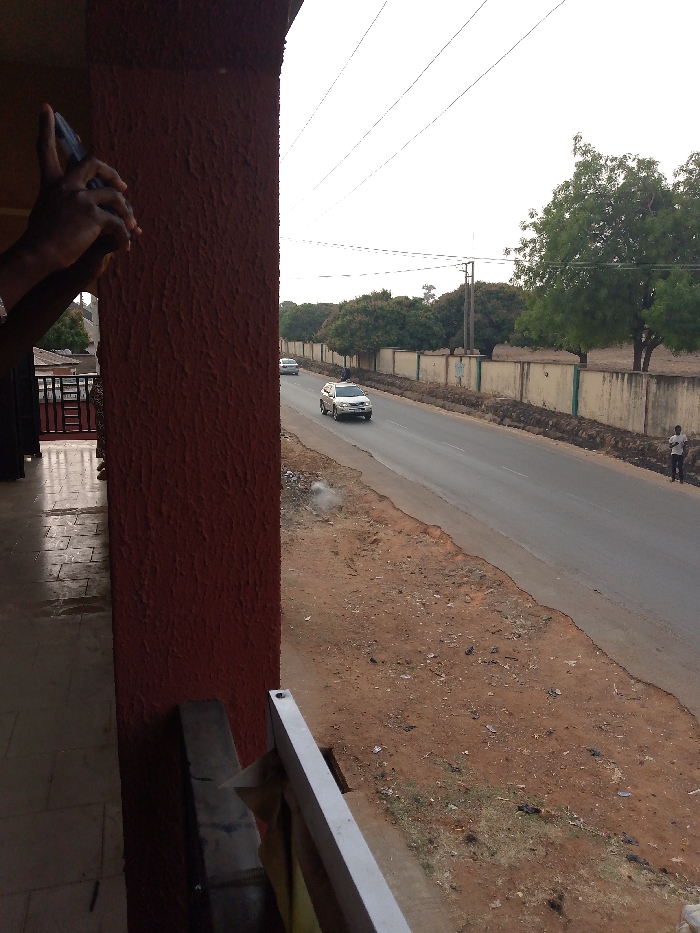 A partly obstructed view from a building shows a road with two cars and a person walking alongside a wall bordering green trees. Brown, textured walls and hands holding a phone appear in the foreground. Dry, reddish soil is visible near the road edge. Utility poles and wires stretch across the sky.