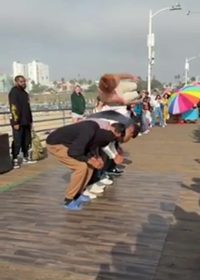 A video captures a lively performance on a wooden pier, likely in Santa Monica based on the skyline in the background. Several people stand bent over at the waist in a line, facing the camera. A shirtless young man with red curly hair runs and dives over them. A man with a microphone and yellow pants, likely a performer, stands near a black speaker. Another man with a black hoodie stands beside him. Several spectators are visible including a child with a stroller. The sky is overcast and the pier is somewhat crowded.