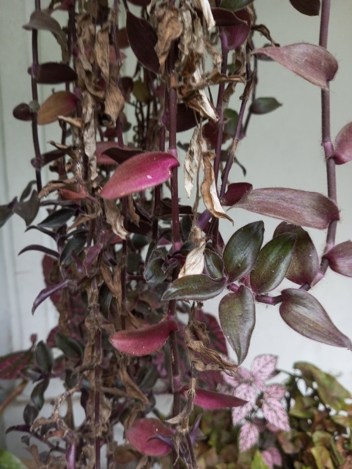 A close-up photograph depicts a trailing plant characterized by dark purple stems and lanceolate leaves. A significant portion of the plant exhibits withered, brown, and shriveled leaves, intermingled with healthier leaves displaying vibrant magenta, deep purple, and dark green hues. The healthy leaves appear to have a fine, fuzzy texture. In the background, a plain, light-colored surface, likely a wall, occupies the upper and central portions of the frame. Towards the lower right, part of another plant is visible, featuring smaller, pale green leaves marked with pinkish variegation. No people are present. No actions or interactions are depicted. The image does not provide discernible details to confirm the specified location of Pandaria, India.