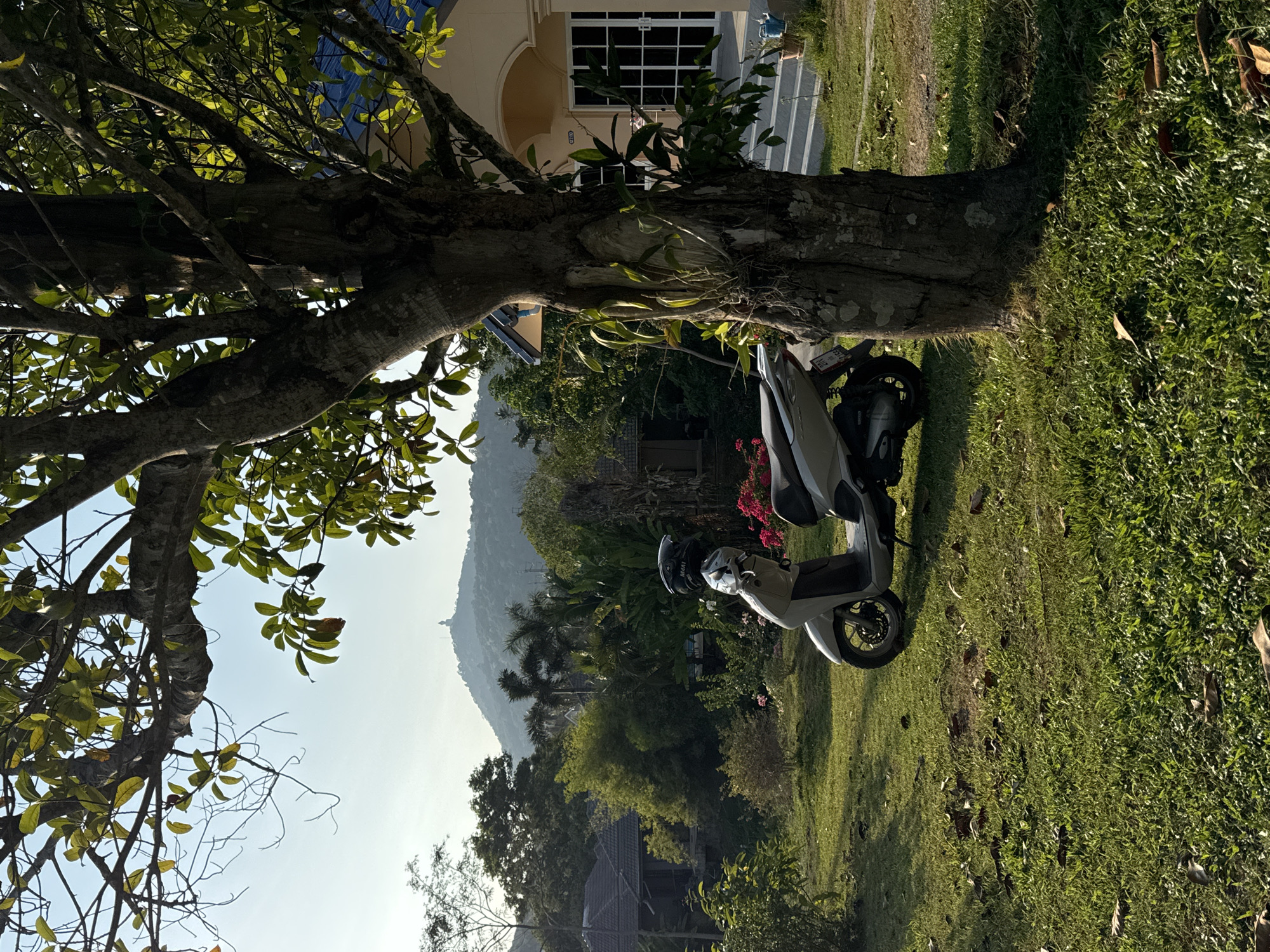 The image displays an outdoor scene in Rawai, Thailand, characterized by natural light and extensive vegetation. In the foreground, a light-colored (beige/silver) scooter is parked on a manicured green lawn with scattered dry leaves. A dark helmet rests on the scooter's handlebars. To the right, a large tree trunk occupies a significant portion of the frame, its canopy featuring green leaves against a bright sky. Epiphytic plants are visible growing on the tree's trunk. In the midground, behind the tree on the right, a cream-colored house with a blue-tiled roof is partially visible. It features a prominent arched entrance with white-framed double doors and a house number "C7/10" above it, accessed by concrete steps. A blue watering can and potted plants are situated near the steps. Various tropical shrubs, bushes with pink flowers, and other trees fill the area between the scooter and the houses. Another residential building with a dark-tiled roof is partially visible in the left midground. The background reveals a large, forested mountain range under a pale blue sky. Perched atop the highest peak of this mountain, the distinct white structure of the Phuket Big Buddha statue is clearly visible, identifying the general location within Phuket, with Rawai being a specific district. Power lines are faintly discernible on the mountainside. No individuals are present in the scene.