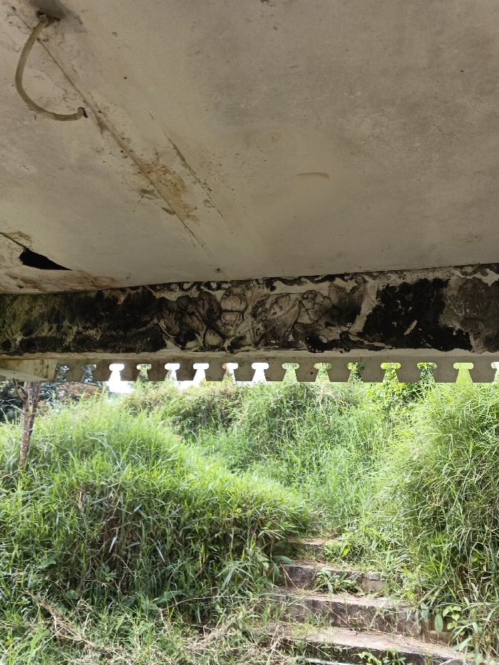 An aged concrete structure looms above lush greenery. The ceiling, marred with stains and cracks, hosts a dangling wire. Below, a frieze of indistinct carvings adorns the beam, heavily shadowed and weathered. Further down, a patterned railing edges the structure. Thick grass and vegetation obscure a set of weathered stone steps leading upwards. The overall impression is one of neglect and the encroachment of nature on a decaying building.