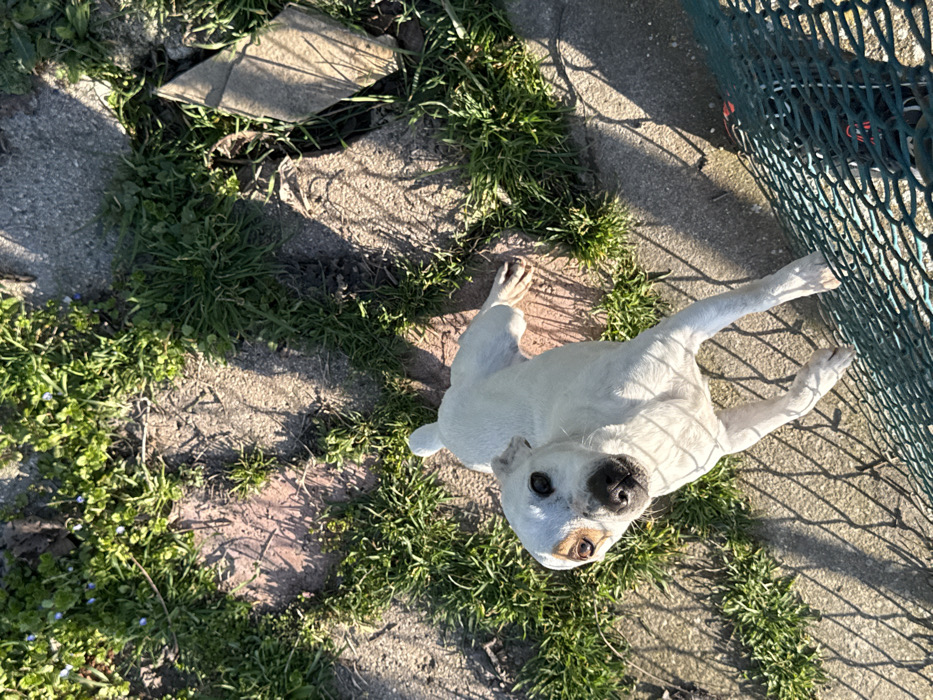 - "A white, short-haired dog stands outdoors on an uneven surface of concrete pavers and interspersed green grass, located in Sarnevo, Bulgaria" by FM-en3To2, licensed under CC BY 4.0