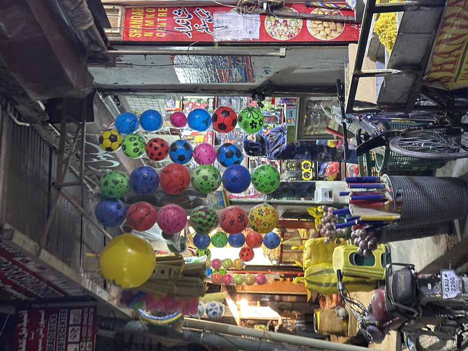 A narrow street market features hanging colorful inflatable balls. Signs read "Shandar Nimko Centre" and "Deal Toys & Sports Center". A bicycle and motorcycle are parked along the right side. A basket of bats and balls sits near the motorcycle. The alleyway is packed with various goods and merchandise. The scene appears to be a bustling market area.