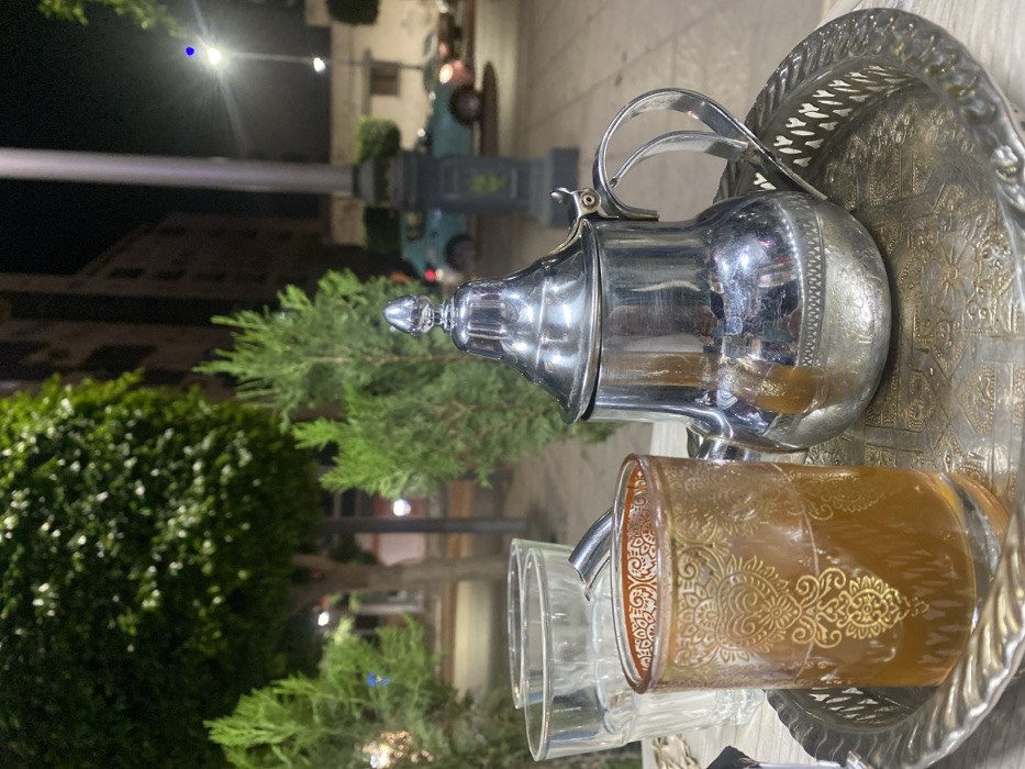- "A silver teapot sits on a decorative silver tray, with a full glass of tea in front and an empty glass beside it" by FM-lxMVB3, licensed under CC BY 4.0