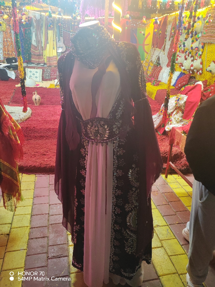 A mannequin displays a traditional dress, featuring a white inner layer and a dark outer robe with intricate silver embroidery and sheer maroon sleeves. It is cinched at the waist with a decorative belt. The mannequin also wears a matching head covering. The scene includes a vibrant background with colorful textiles and decorative items, creating a festive atmosphere. The foreground showcases a tiled floor and a person's arm, partially visible on the right.