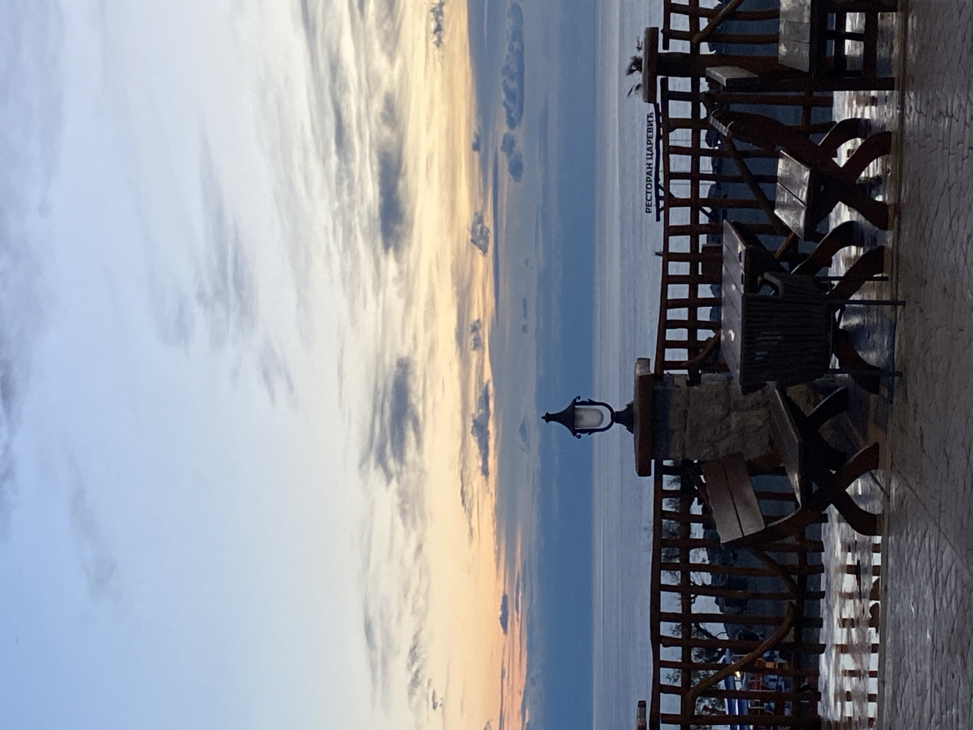 The image is a vertical outdoor shot of a seaside restaurant in Kovačko Polje, Montenegro, at sunset. The left side of the frame is dominated by a sky with streaky clouds tinted with orange and yellow hues from the setting sun. To the right of the sky is the sea. The restaurant's wooden fence and terrace occupy the right side of the frame. Wooden tables and chairs are visible on the terrace. A traditional-style streetlight stands near the edge of the terrace. The Cyrillic script 'PECTOPAH ЦАРЕВИЋ' (Restaurant Carevic) is seen on the wooden fence of the restaurant.
