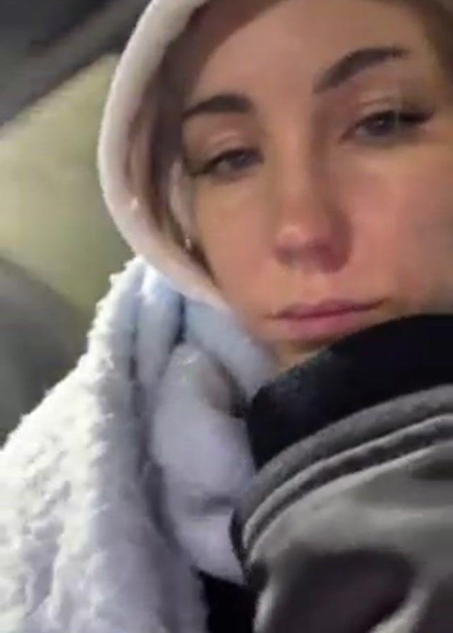 A woman with fair skin and blonde hair is wearing a white hooded sweatshirt and a light blue scarf. She is looking directly at the camera with a slightly downcast expression. The camera angle is from her perspective, and she seems to be holding the camera herself. In the background, there is a soccer field at night. Several people are playing soccer, and there are floodlights illuminating the field. There also appear to be a few tents or structures along the side of the field. The woman seems to be watching the game.