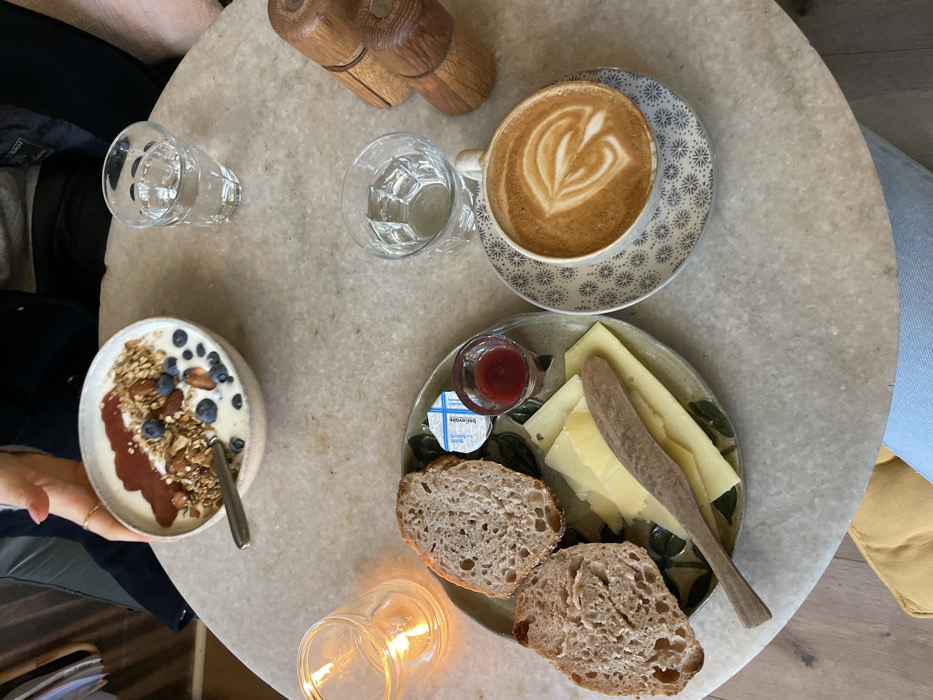 The image depicts a meal served on a light-colored, veined marble table, likely within a cafe or restaurant in Frederiksberg, Denmark