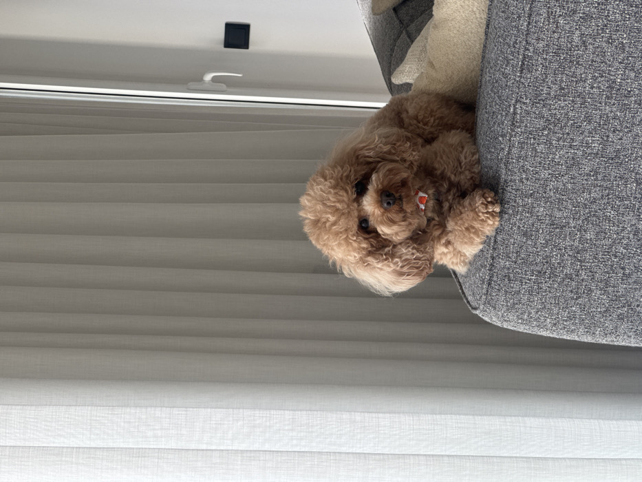 The scene depicts an indoor setting, located in the city of Loures, Portugal. A small, light-brown, curly-haired poodle-type dog is positioned on a grey, textured fabric sofa. The dog is lying down, facing forward, with its front paws resting on the sofa's armrest or backrest. A red and white patterned collar or bandana is visible around the dog's neck. A light-colored cushion is partially visible behind the dog on the sofa. The background features light-colored sheer vertical blinds or curtains, which cover a window to the left. To the right of the curtains, a white window frame with a white handle is visible, along with a small black rectangular electrical component or switch mounted on a light-colored wall. No other individuals or significant actions are observed. The environment appears to be a residential living space.