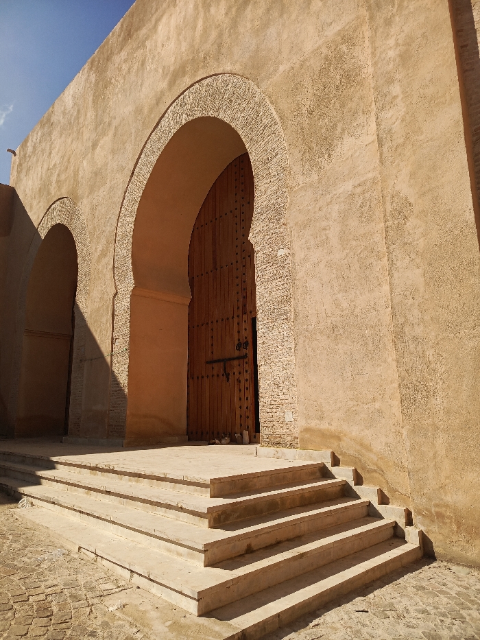 This image depicts a detail of the monumental Bab Mansour gate in Meknes, Morocco, under clear daylight conditions. The scene is dominated by a large, light-ochre textured wall featuring two prominent horseshoe arches. The central and larger arch frames a massive, dark brown double-leaf wooden door, heavily studded with metal, and secured horizontally by a dark metal bar. The facade of this main arch is intricately carved with calligraphic or geometric patterns. To its immediate left, a smaller, similar horseshoe arch is partially visible, casting a long shadow across its interior. A multi-tiered set of light-colored stone steps leads upwards from a cobblestone pavement to a flat platform directly in front of the large wooden door. A small, light-colored cat is visible seated on this platform at the base of the wooden door. Strong sunlight illuminates the scene from the right, casting distinct shadows.
