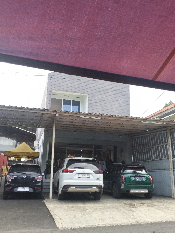 This image depicts a commercial establishment in Tasikmalaya, Indonesia, viewed from below a dark red overhead shade cloth