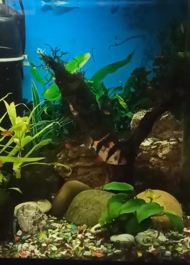freshwater aquarium, filled with colorful gravel, rocks, aquatic plants, and driftwood. A black filter is visible on the left side of the aquarium. Several tiger barbs, with distinctive black and orange stripes, swim throughout the tank. The background of the tank is a bright blue.