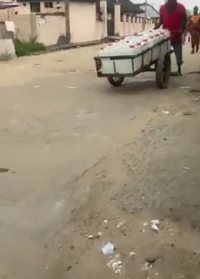 A man in a red shirt and blue jeans pulls a two-wheeled cart loaded with white jerrycans down a street in a residential area. Another person walks in the distance. Buildings are visible on either side of the street. A tall utility tower stands in the background.