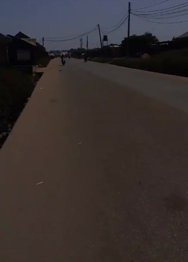paved road under a bright sky. Several motorcycles are seen traveling along the road. The road is bordered by buildings and vegetation. Overhead power lines are visible along the road. The day appears sunny.