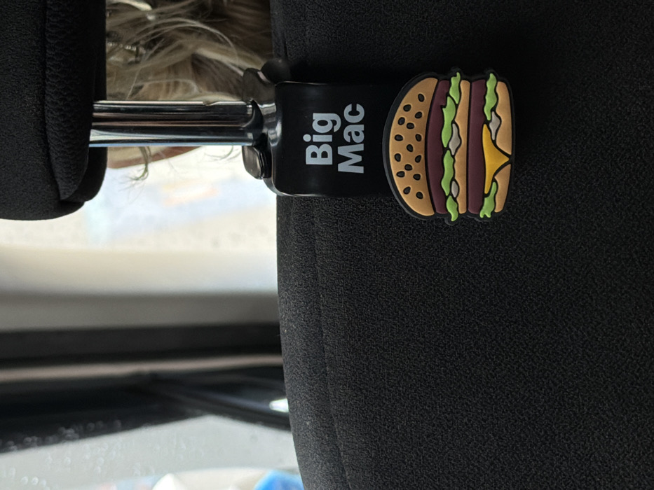 A black car seat headrest with a metal support post is visible. A black clip with the words "Big Mac" and a cartoon Big Mac image are attached to the headrest support. The Big Mac has two buns, two layers of lettuce, two layers of meat, and a layer of cheese. The background is blurry, with a hint of blond hair.