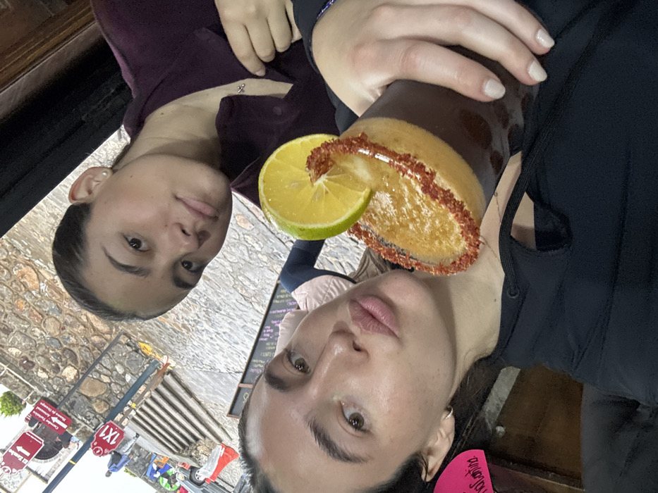 Two adult females are captured in a selfie-style photograph, appearing to be seated indoors or in a covered patio area in Huasca de Ocampo, Mexico