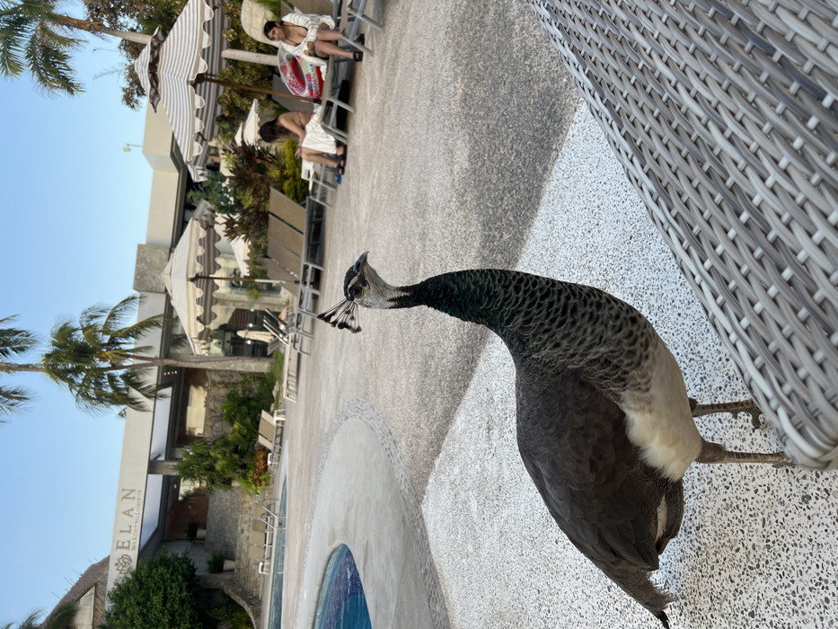 - "A peacock stands beside a patio chair near a pool" by FM-sBHb22, licensed under CC BY 4.0